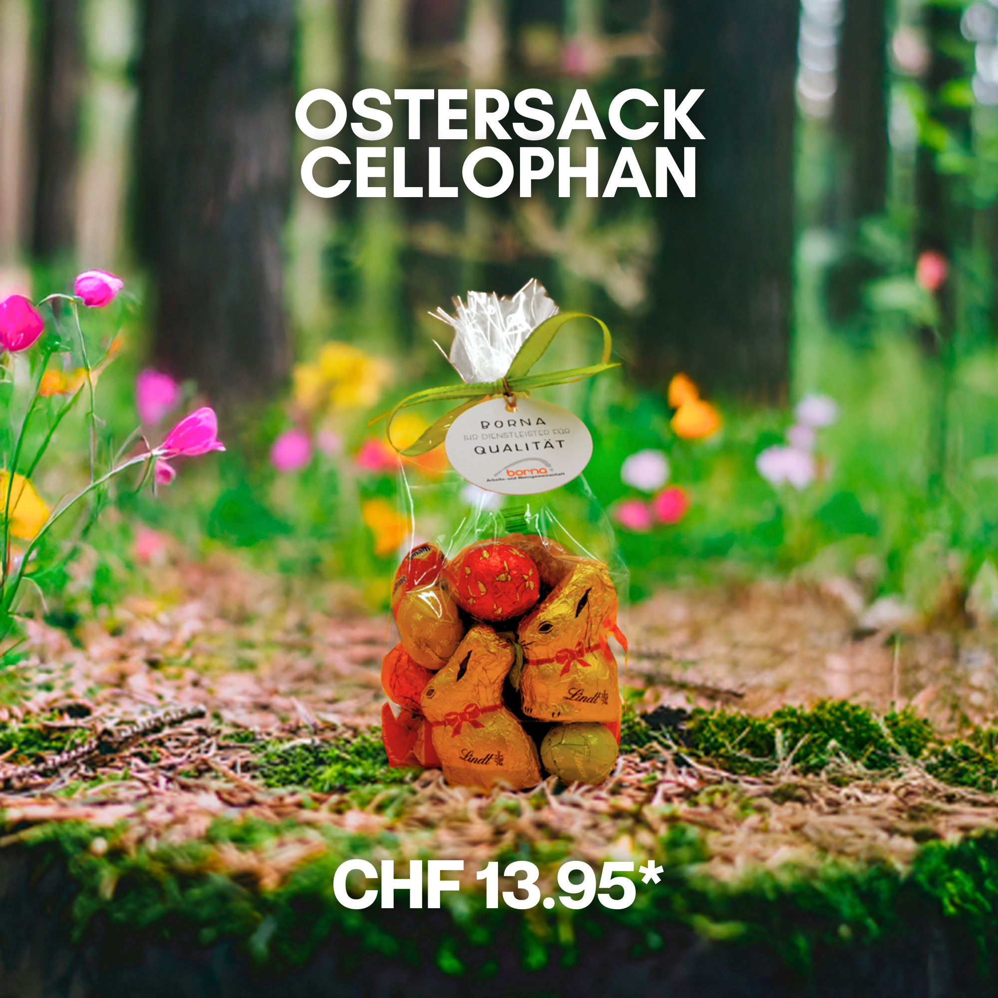 Ostersack Cellophan – Perfekt für alle, die es klassisch mögen: Hochwertige Schokolade von Lindt, Ragusa und Ovo Eili, kombiniert mit fruchtigen Geleehäschen.